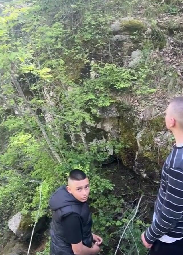 Two young males are standing in a lush, green, wooded area next to a rocky cliff face. One male is wearing a black shirt, black vest, and dark shorts. The other male is wearing a black and white striped shirt and dark pants. The wooded area has trees, shrubs, and greenery covering the cliff face. There is a small stream flowing at the bottom of the cliff. The male in the vest looks at the camera, then the camera pans down towards the stream.