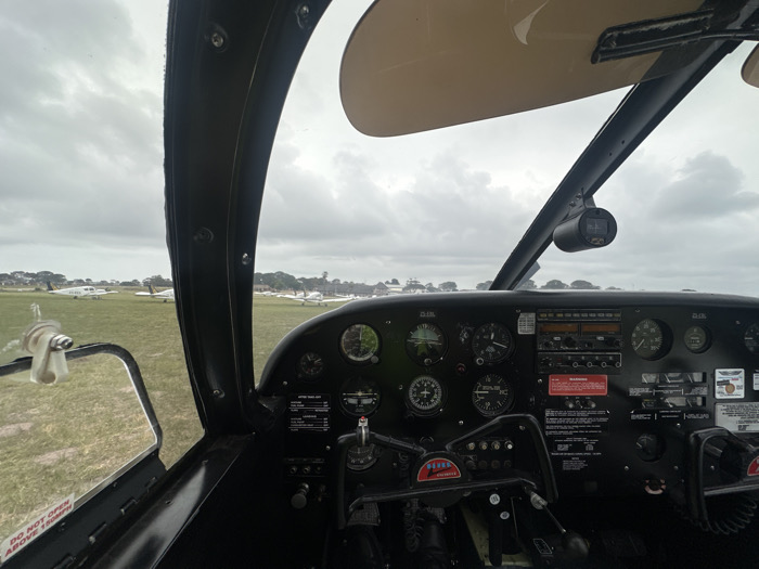 - "The image depicts a view from within the cockpit of a light aircraft, likely a Piper, looking out onto a grassy airfield" by FM-7s0Mk2, licensed under CC BY 4.0