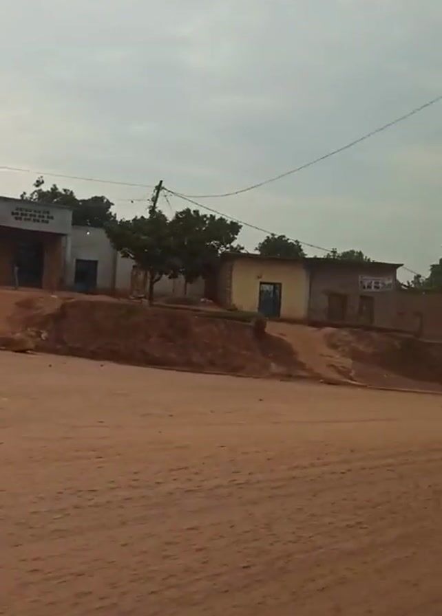 The video captures a scene of a dirt road with buildings and people