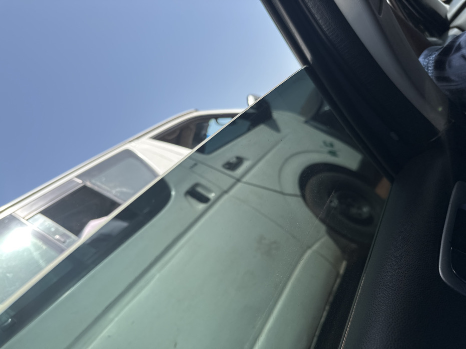 The image captures an exterior scene from the interior perspective of a vehicle in Bishini, Nigeria. A white passenger van is prominently positioned outside, viewed through a partially rolled-down, tinted side window. The van displays multiple side windows, a visible sliding door handle, and a dirty or scuffed lower body, with its black wheels visible. A bright, clear blue sky dominates the upper background, with sun glare reflecting off the van's upper windows. In the foreground, the dark, textured interior door panel and handle of the observation vehicle are visible. A small portion of a blue garment is discernible in the lower right corner, indicating a person is inside the vehicle from which the photograph was taken.