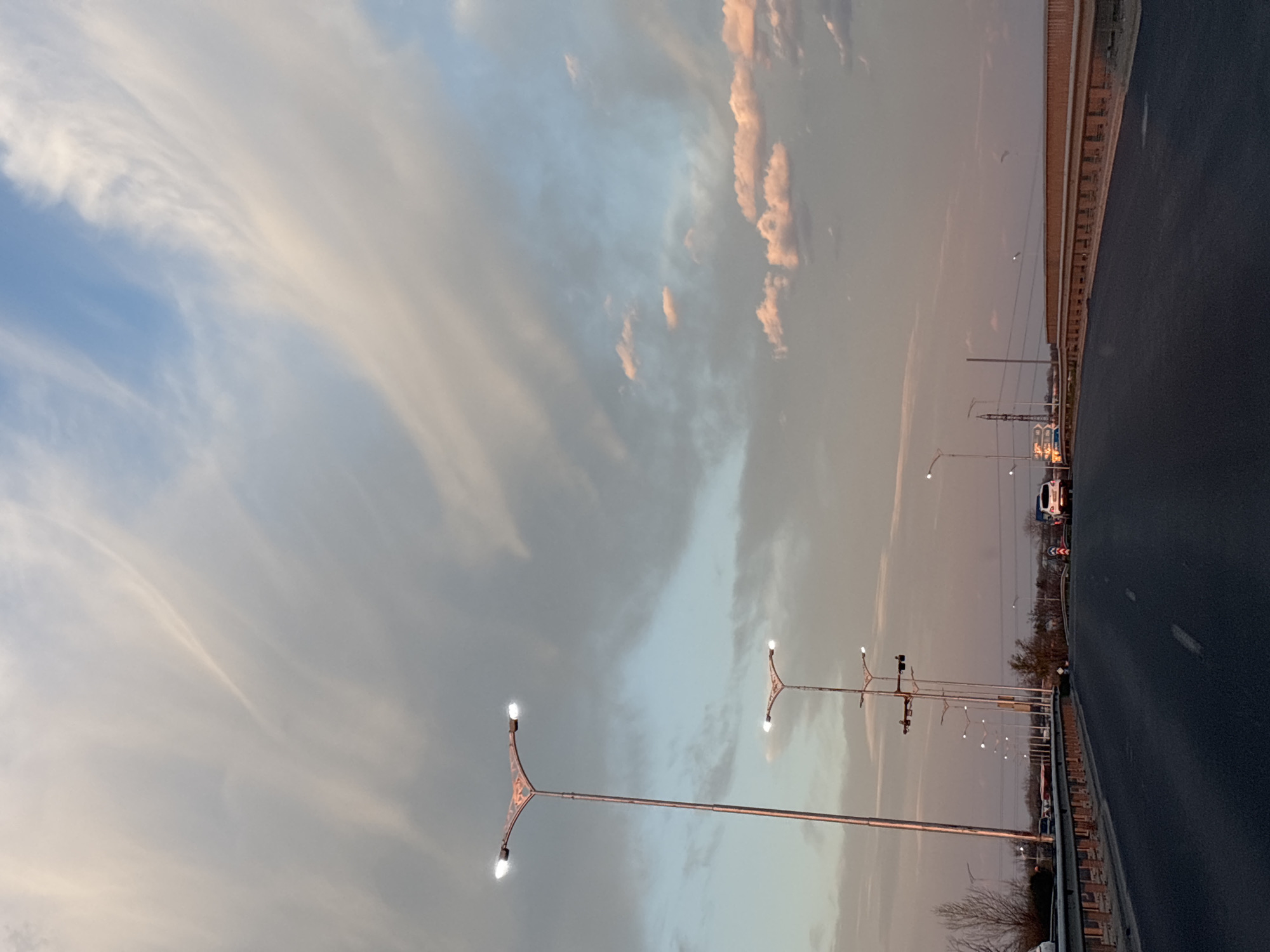 The image depicts an elevated highway in Plovdiv, Bulgaria, at dusk. The sky is predominantly blue with patches of grey and pink clouds illuminated by the setting sun. An asphalt road occupies the right side of the frame, bordered by a metal guardrail. Streetlights with unique Y-shaped arms and multiple bulbs are spaced along the roadside. In the distance, vehicles and other street furniture are visible. The photograph is taken from a slightly elevated perspective.