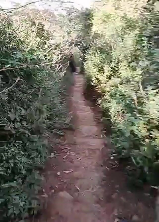 narrow, dirt trail winding through dense green vegetation. The path is reddish-brown and slightly uneven, with occasional rocks or debris visible. The vegetation on either side consists of various leafy plants, bushes, and small trees, creating a tunnel-like effect. The light is filtered, suggesting an overcast or shaded environment. The camera appears to be moving forward along the trail, creating a first-person perspective of walking. The camera moves erratically and is often off center.