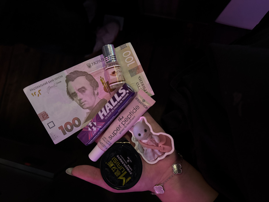 A left hand, featuring light-colored fingernail polish and a multi-clover bracelet, grasps a collection of personal items. The items include two 100 Ukrainian Hryvnia banknotes, a purple package of Halls lozenges (forest fruit flavor), a pink tube of "essence the super peptide glossy lip treatment," a black circular container of "MURISI HYALURONIC ACID REPAIRING CREAM," a small glass rollerball bottle, and a sticker depicting a white anthropomorphic cat or rabbit character in a pink dress. The scene is illuminated by a distinct magenta-pink light, with a dark, indistinct background. No specific location within Dnipro, Ukraine, is identifiable from the provided image.