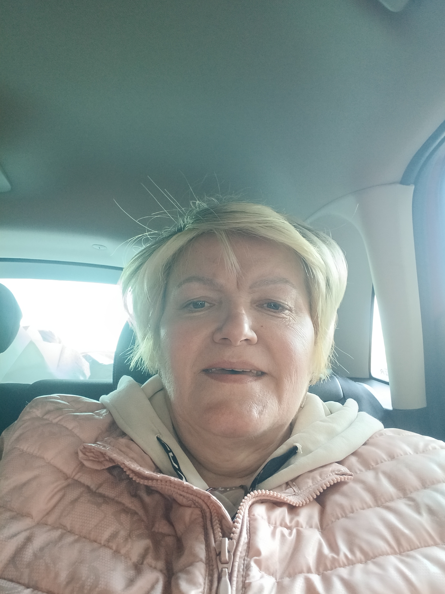 The image captures a middle-aged female subject, seated inside a vehicle in Akulovo (Gp Kubinka), Russia. The subject possesses short, light blonde hair and visible facial wrinkles, with light-colored eyes. She is wearing a light pink, quilted jacket, partially unzipped, over a cream-colored hooded sweatshirt. The subject is looking directly forward, implying a self-portrait. The vehicle's interior is visible, including a light-colored headliner and a bright, overexposed view through the rear window, indicating strong daylight conditions. A dark seatback is partially visible behind the subject.