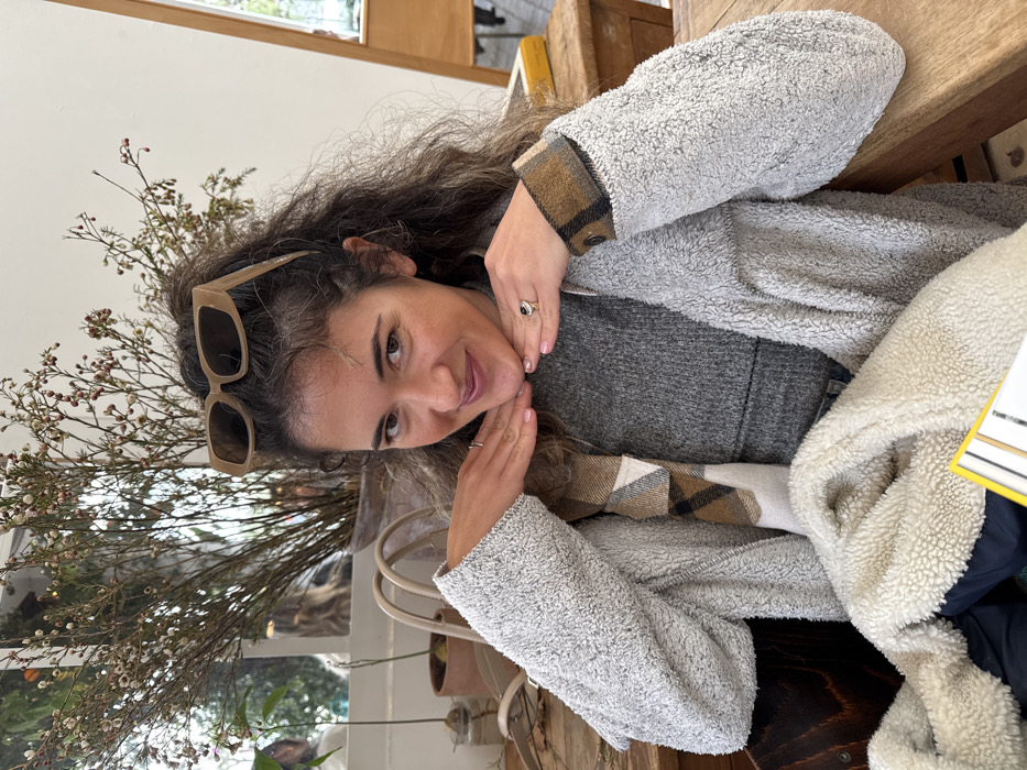 A female subject is depicted in a seated position at a light-colored wooden table within an indoor setting, identified as being in the Vouliagmeni Municipal Unit, Greece. She has dark, curly hair pulled back, with tan rectangular sunglasses resting on top of her head. Her hands are positioned under her chin, thumbs supporting the jawline, displaying light pink nail polish, two thin silver rings on her left hand, and a dark ring on her right ring finger. She is wearing a grey textured open cardigan over a dark grey top, with a brown and white plaid garment visible underneath. A slight smile is present on her face as she looks directly at the camera. The background consists of a large vase containing dried botanical branches, a smaller potted plant to the left, and a light-colored wall featuring a window reflecting outdoor foliage and indistinct forms. A light-colored bag is partially visible behind the plant, and a yellow-covered object rests on a wooden surface to her right.