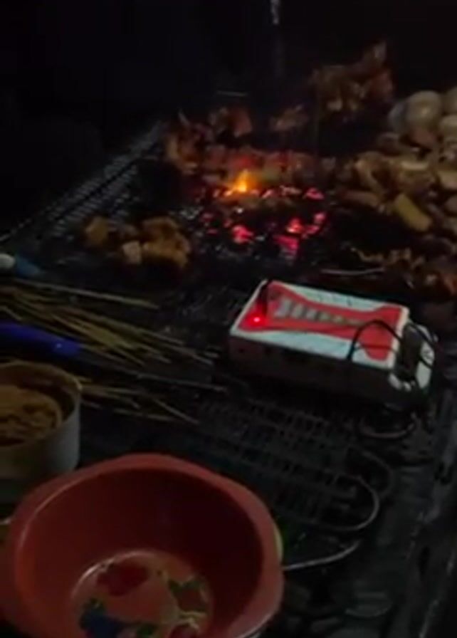 nighttime outdoor food stall with a charcoal grill cooking chunks of meat and what appear to be boiled eggs. A red bowl and a container of peanut butter are on a metal table next to the grill, along with bamboo skewers. A power bank is also on the table next to the grill. A person wearing a yellow plastic bag on their hand appears briefly in the video. The scene is dimly lit.