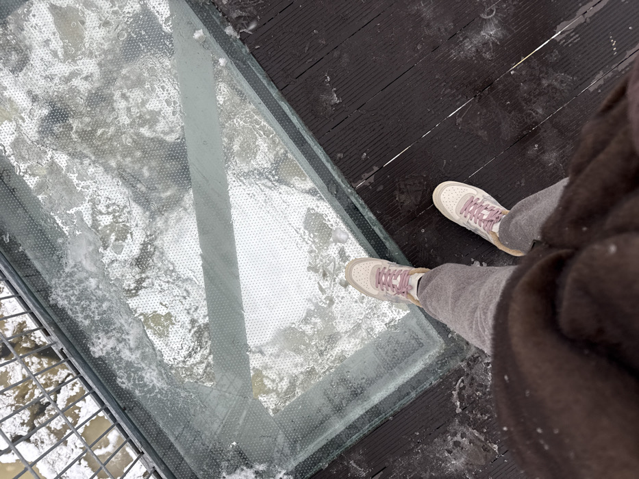 The image displays a top-down perspective of a person standing on a glass-bottomed walkway or bridge in Мастоўскі сельскі Савет, Belarus. The individual's lower legs are visible, wearing grey trousers and light-colored sneakers with pink laces. A dark brown garment is visible in the foreground. The clear glass panel directly beneath the feet is partially obscured by patches of snow, ice, and water droplets. Below the glass, a turbulent, muddy-brown body of water with white foam and ice is discernible. To the left of the glass section, a metal grate structure is visible over the water. To the right, the adjacent walkway consists of dark wooden planks, also bearing scattered snow and ice.