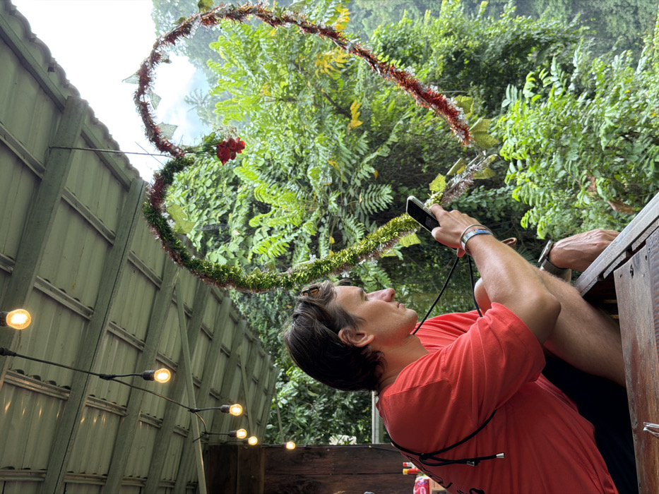 A man in a coral-colored shirt stands with his head tilted upward, holding a black smartphone to take a picture of a heart-shaped decoration made of greenery and red tinsel. The decoration hangs against a backdrop of lush green foliage. A string of warm-toned lights runs along a corrugated fence on the left. The man has short brown hair, is wearing bracelets, and is partially obscured by a wooden structure.
