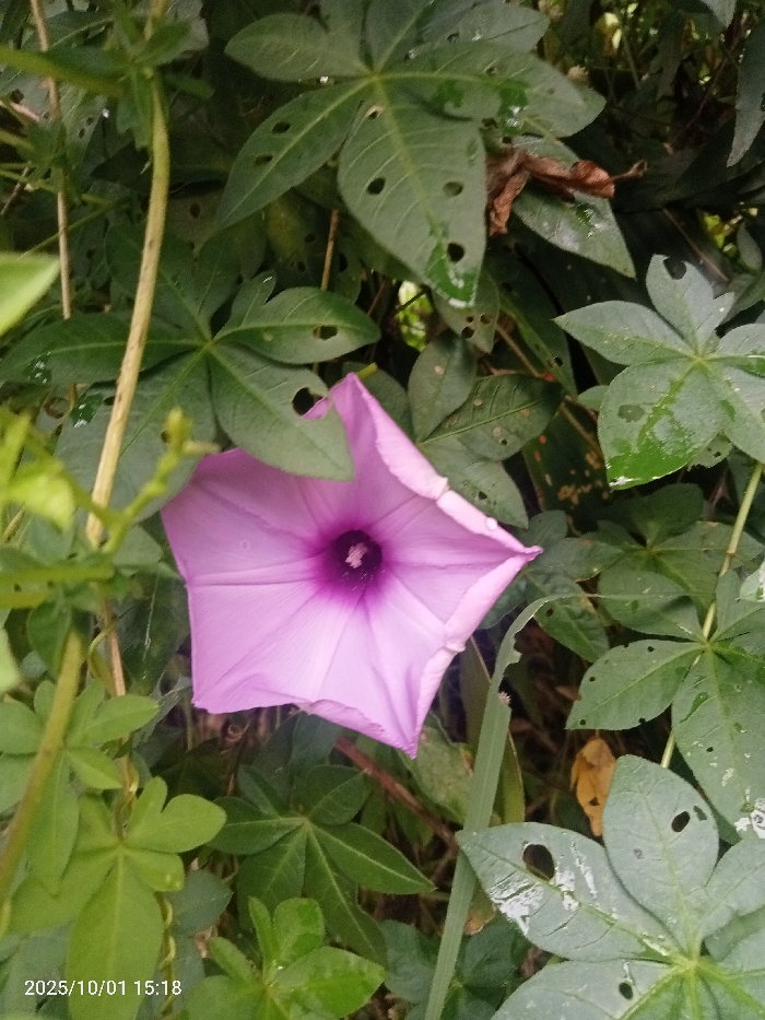 The image displays a single, open, trumpet-shaped flower, primarily light lavender-purple with a distinct darker magenta-purple throat, centrally positioned within a dense, verdant environment. The flower's petals exhibit visible vertical pleats. It is surrounded by numerous green leaves of varying morphology, some of which appear wet or dewy and show multiple small, irregular perforations consistent with insect damage. Slender green vines or stems are interwoven among the foliage. Scattered brown, dried leaf matter is visible in the background. No individuals or animals are present. A timestamp, "2025/10/01 15:18," is imprinted in the lower-left corner of the frame. The scene is located in Ciputri, Indonesia.