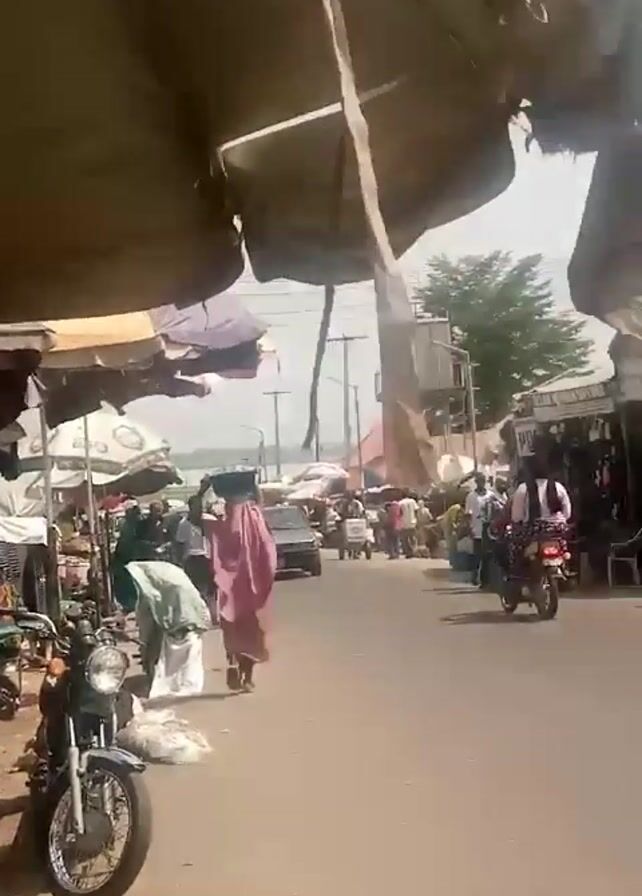 bustling street market in what appears to be an African city. People are walking and riding motorcycles, moving along the paved road that cuts through the market. Street vendors have set up stalls, shaded by umbrellas and awnings, displaying various goods, including textiles and clothing. A parked motorcycle sits near a stall with stacked colorful items. A woman wearing a hijab is seated nearby. A black Toyota Corolla drives past, momentarily stopping. The atmosphere is busy and filled with the sounds of the market. Buildings and infrastructure, including electrical poles and water tanks, are visible in the background.