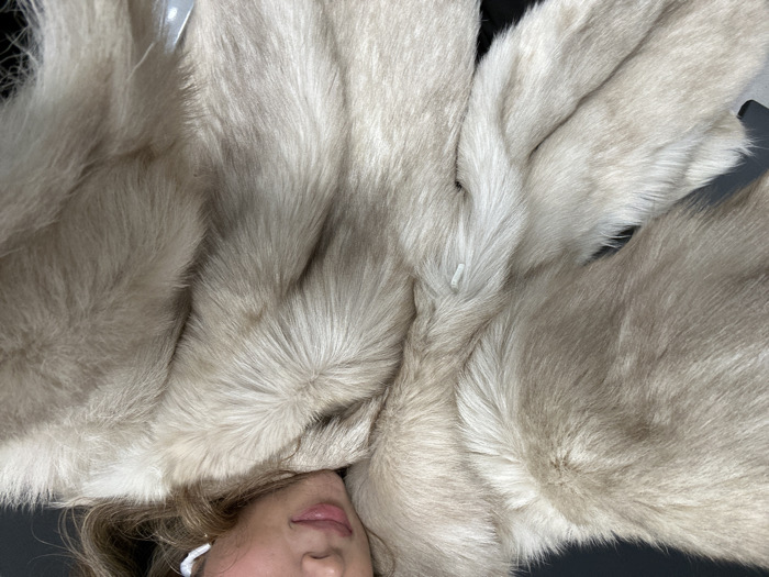 A female individual is depicted in a close-up view, wearing a voluminous light beige or off-white fur coat