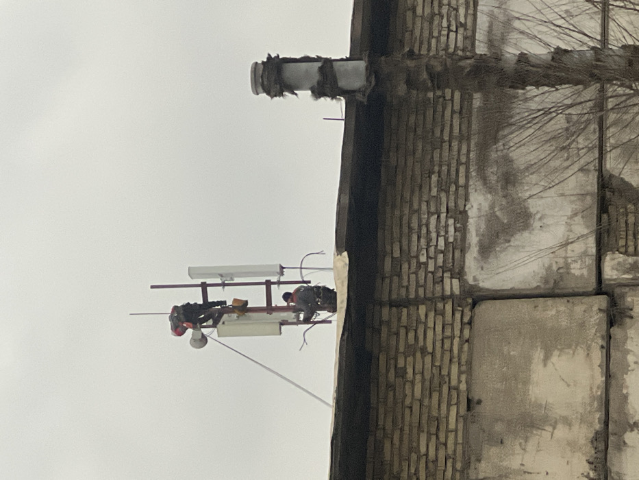 The image depicts two individuals engaged in work on a cellular communications tower situated atop a building in Andijan City, Uzbekistan. The tower, constructed from a reddish-brown metal framework, supports multiple white rectangular antenna panels and a smaller, lighter-colored circular antenna. One worker, wearing a red helmet and dark work attire, is positioned higher on the tower, actively manipulating components near the circular antenna. The second worker, also in dark work attire and possibly wearing a helmet, is situated lower on the tower, closer to the building's roof level. Both workers appear to be utilizing safety harnesses, with visible ropes and cables integrated into the tower structure. The building below the tower features a dark, flat roof with a light-colored, possibly reflective, material along its immediate edge. The upper section of the building's wall is constructed from light yellow-brown bricks, exhibiting mortar lines and some visible wear. Below the brickwork, the wall transition to large, light-grey concrete blocks, which show signs of weathering and discoloration. To the right of the cellular tower on the roof, a tall, cylindrical pipe-like structure, possibly a chimney or vent, stands vertically. This pipe is wrapped intermittently with a dark, fibrous material. The background consists of an overcast, light grey sky. Sparse, bare tree branches are visible in the lower right foreground, partially obscuring the building's concrete base.
