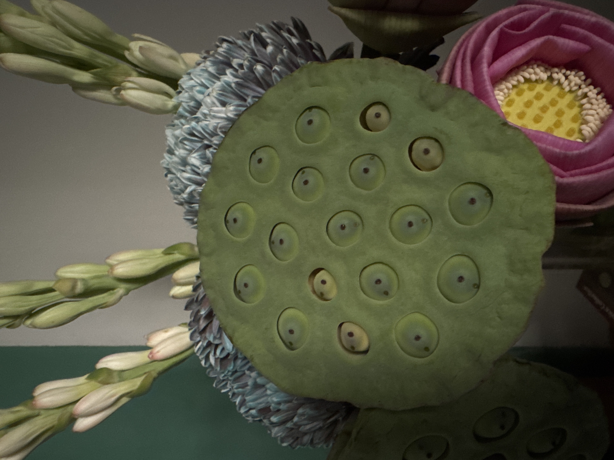 A close-up shot reveals a floral arrangement. Dominating the composition is a green lotus seed pod, punctured with many holes, each potentially containing a seed. Adjacent to the seed pod is a blue thistle-like flower. To the left, a cluster of white tuberoses are present. Towards the right of the frame, there's a pink lotus flower showcasing a yellow center. The background is a blend of neutral tones. The image was taken in North Kuta, Indonesia.