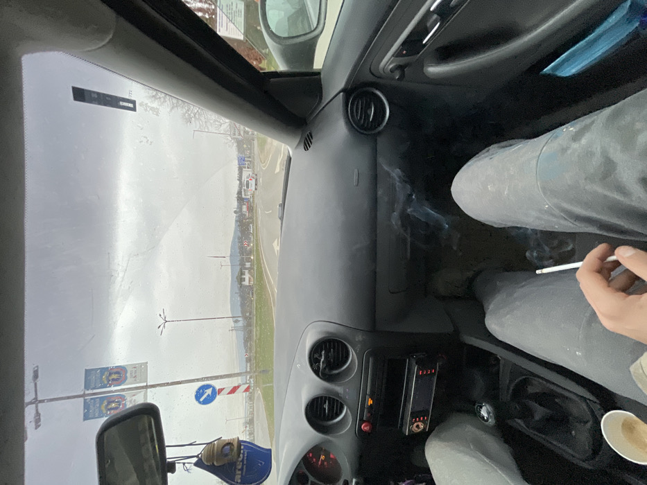 The image depicts the interior of a vehicle, viewed from the front passenger seat, looking forward through a wet windshield. A person's hand in the lower left holds a lit cigarette, producing a plume of smoke rising into the passenger footwell, adjacent to a disposable cup containing a light-brown beverage. The person's legs, clothed in grey trousers with visible marks, occupy the lower half of the frame. The vehicle's dashboard, central air vents, and a radio/media player are visible. An "Areon" brand air freshener and a decorative item hang from the rearview mirror. Beyond the windshield, the scene shows a multi-lane road approaching a large roundabout in Montana, Bulgaria, as indicated by banners on a tall pole to the left, which display "ОБЩИНА МОНТАНА" and "ДОБРЕ ДОШЛИ В МОНТАНА" (Municipality of Montana, Welcome to Montana). A blue circular sign with a white right-pointing arrow and a red-and-white striped pole mark the entrance to the roundabout. Tall streetlights are positioned around the road. Distant vehicles, including a white van and a red truck, are visible on or traversing the roundabout. A small, white building is discernible across the roundabout. The surrounding environment features sparse, leafless trees and distant hills under a uniformly overcast, grey sky.