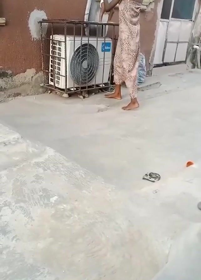 A woman holding a baby stands on a concrete surface outside a building. The woman is barefoot and wearing a long, tan-colored dress with a brown pattern. Her hair is pulled back. She holds the baby, who is wearing a white outfit, up towards a window. An air conditioning unit enclosed in a metal cage sits nearby. The building is painted in earth tones. There are objects scattered on the concrete surface.
