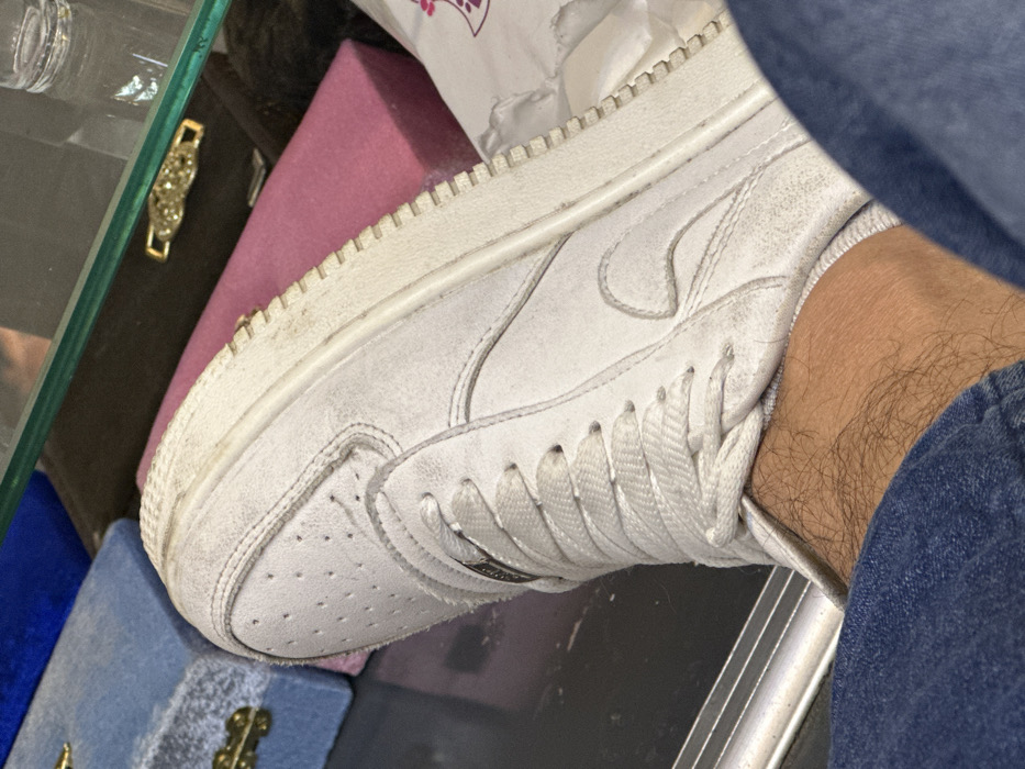 - "An upward-angled view captures a person's right foot, shod in a worn, white, low-top athletic shoe with blue denim jeans, resting at an unspecified indoor location within Barza Municipality, Syria" by FM-shBps1, licensed under CC BY 4.0