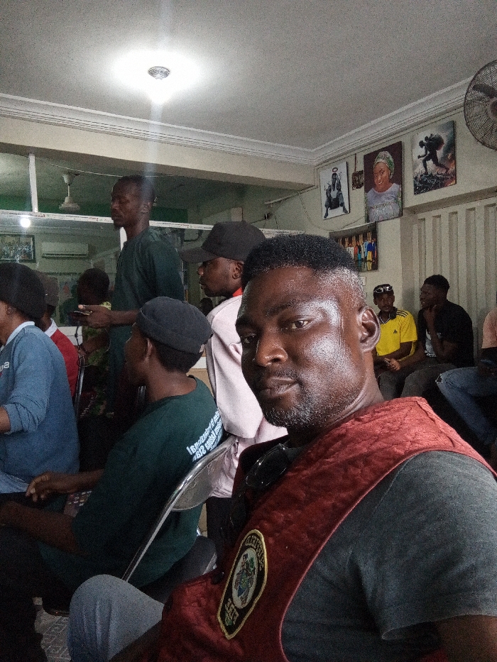 The image depicts an indoor gathering of approximately eight individuals in the city of Sardauna, Nigeria. In the immediate foreground, a dark-skinned male with a fade haircut and short beard is facing the camera, displaying a slight smile. He wears a dark grey t-shirt and a dark red, possibly quilted, garment draped over his left shoulder, featuring an emblem with crest-like elements and text. Sunglasses are tucked into his t-shirt collar. To his left and rear, other individuals are visible. One person in a dark green t-shirt and black beanie sits facing away, with reversed text visible on their back. Another man stands in a dark green shirt, holding a mobile phone. A man wearing a light-colored shirt and a black baseball cap is also visible. Further in the background, a person in a yellow t-shirt and sunglasses is seated, along with another individual in a dark shirt. The room features light-colored walls and a white ceiling with decorative molding. A bright, circular light fixture is centrally positioned on the ceiling, producing a noticeable lens flare. An air conditioning unit is mounted on the far left wall. On the right wall, several framed art pieces are displayed, including a black and white image, a colorful portrait of a woman, and a dynamic depiction of a figure. A white ceiling fan is partially visible in the upper right corner. The individuals are predominantly seated on metal chairs, indicating a communal or waiting area. No dynamic actions or explicit interactions between subjects are discernible.