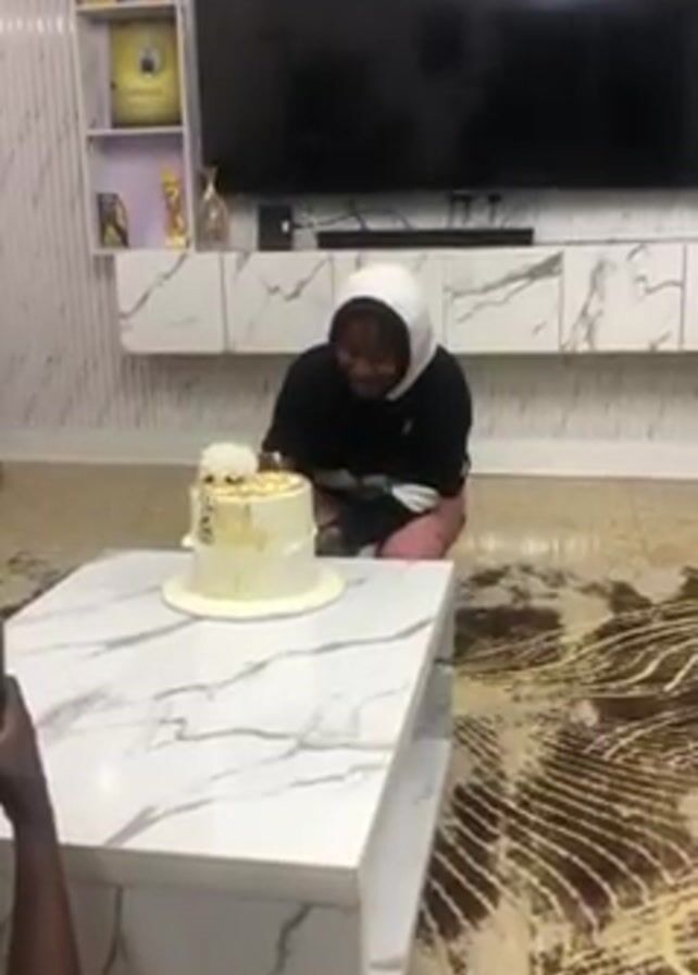 A person kneels in front of a cake on a white marble coffee table. Another person stands and films the scene with a phone. The person kneeling in front of the cake is wearing a white head covering, a black sweatshirt, and pink pants. The cake is white with gold accents. There is a small white decoration on top of the cake. The room has a modern interior with a large flat-screen television and marble accents on the wall and furniture. The floor has a patterned rug.