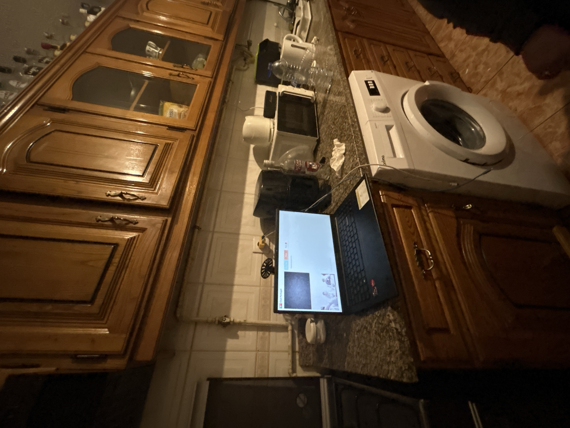 This image depicts a domestic kitchen located in Bragança, Portugal. The scene is illuminated by artificial light, revealing a brown tiled floor, light-colored square tiled backsplash, and dark granite-patterned countertops. Above the countertop, a series of traditional wooden cabinets with carved details are mounted, some featuring glass-front doors displaying various items. On top of the uppermost cabinets, multiple bottles and decorative items are visible. On the countertop, a black laptop is open, displaying a video chat interface titled "Chat Portugal." The screen shows a static or noisy webcam feed on the left, and a smaller preview of two individuals seated at a table below. To the left of the laptop, a dark-colored appliance (possibly an oven or stove) is partially visible. To the right of the laptop, various objects are present: a white lidded container, a white power adapter, a black coffee machine, a clear bottle of spirits labeled "BODKA," a crumpled white tissue or paper, a white microwave oven, a small black rectangular speaker, a crushed clear plastic water bottle, and a white electric kettle. Below the countertop, wooden base cabinets with brass-colored handles match the upper cabinetry. A white, front-loading "Orima" brand washing machine is integrated between these base cabinets. The lower right portion of the image shows the dark-sleeved arm and shoulder of an unidentified individual.