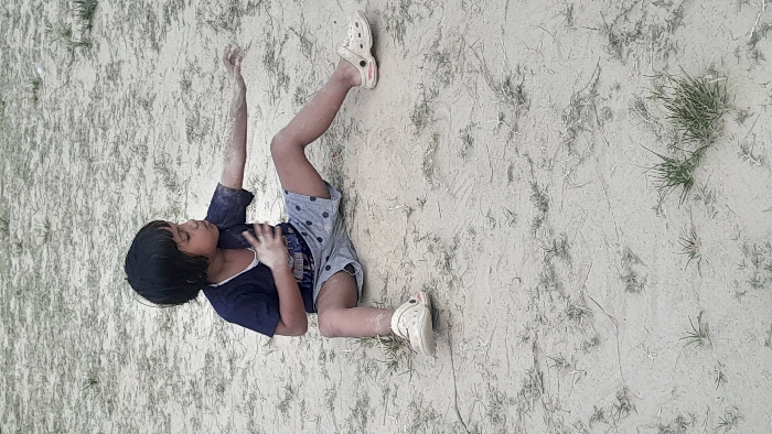 - "An individual child is seated on light beige, sandy ground with sparse green vegetation, located in Lhokseumawe, Indonesia" by FM-hcL462, licensed under CC BY 4.0