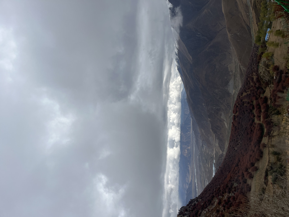 A wide-angle, elevated landscape view depicts a mountainous region near Lhasa, China, under a heavily overcast sky. The upper two-thirds of the image are filled with dense, grey clouds, with some brighter, whiter cloud formations visible above the distant mountain line. In the left foreground, a steep, rocky slope is covered with extensive patches of dark reddish-brown, low-lying vegetation. To the right, a large mountain rises, its slopes displaying predominantly brown and earthy tones, with distinct patches of white snow visible along its upper ridges. Clouds partially obscure the peaks of this mountain. Between the foreground slopes, a broad valley extends into the mid-distance. The valley floor contains a light blue-grey, winding body of water, possibly a river, surrounded by flat, light brown terrain. Additional mountain ranges are visible in the far background, partially obscured by atmospheric haze. In the lower right quadrant, a small cluster of light-colored buildings, possibly with blue roofs, are situated on a patch of lighter green ground. A section of green mesh or fencing is visible at the extreme bottom right. The scene is devoid of human figures or discernible human activity. The lighting is diffused and even, consistent with a fully cloudy sky.