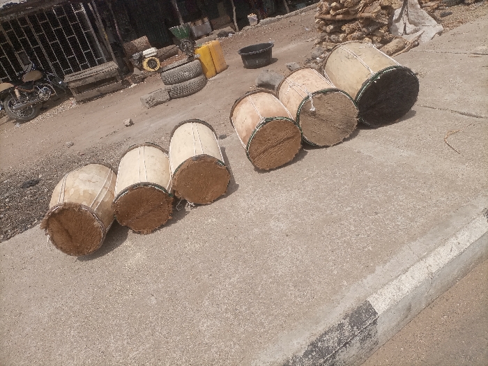 The scene is an outdoor commercial or roadside area in Gulum, Nigeria. Six light-colored, cylindrical drums, appearing to be crafted from wood or similar natural material with fibrous ends, are arranged horizontally on a concrete pavement. The drum on the far right displays a dark, possibly animal hide, surface at one end. A concrete curb with alternating black and white paint delineates the pavement from an unpaved dirt area. Within this dirt area, a dark motorcycle is parked on the left. Further right, stacks of tires, a yellow portable generator, several yellow plastic jerrycans, and a black basin are visible. A large pile of stacked firewood or timber occupies the upper right background. Commercial structures with metal security grates are present in the far left background. No individuals are depicted, and no specific actions or interactions are occurring.