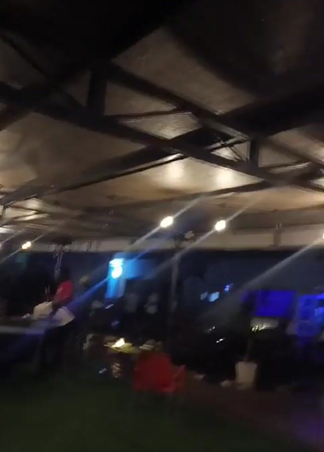 Here's a detailed description of the video: The video takes place in an outdoor bar-like setting under a roof structure