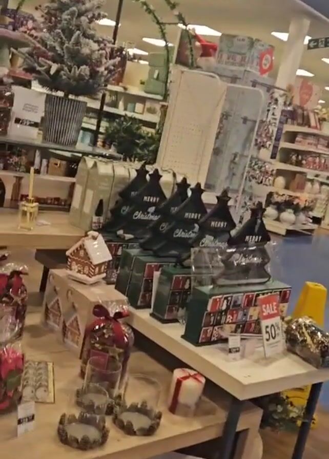 interior of a retail store decorated for Christmas. Displays feature Christmas trees, gingerbread houses, candles, floral arrangements, and other holiday-themed items. Shelves are stocked with various products including vases and home decor. The floor is blue in some areas and wood-like in others. The store is well-lit with overhead fluorescent lights.