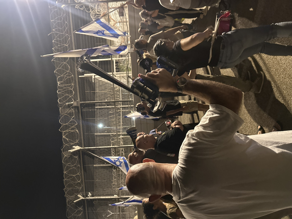 An outdoor nighttime scene depicts a gathering of approximately 15-20 individuals in the City of Unknown, Israel, standing on a paved surface. In the background, a tall, dark-colored mesh or grid fence topped with multiple coiled strands of concertina wire is prominently visible, illuminated by artificial lights. Several Israeli flags on poles are displayed throughout the crowd and near the fence. In the foreground, a bald man with a short beard, wearing a white short-sleeved t-shirt, stands with his back to the viewer. His right arm is raised, holding a black, horn-shaped device, possibly an air horn or noise amplifier, with a metallic component near its flared end. A watch is visible on his left wrist. To his immediate right, a woman, also facing away, is actively playing a small pink drum suspended by a white strap around her waist, holding drumsticks. A blue battery pack is attached to her back, suggesting a powered component to her equipment. In the mid-ground, various individuals are present, predominantly men, many with short hair or bald, dressed in dark t-shirts. One man is observed speaking into a black megaphone, while another nearby wears headphones. The group appears to be actively participating in a demonstration or protest. Shadows are cast on the ground by the artificial lighting.
