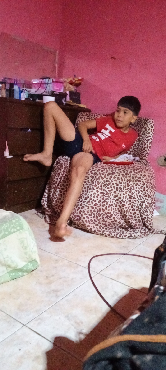 A young boy lounges on a chair covered in leopard print fabric. He wears a red t-shirt and dark shorts. His left leg is propped up on a dark brown wooden dresser. A plate rests on the chair beside him. The room has pink walls and a tiled floor. A beige pillow sits on the floor near the dresser. A black object with metal accents is visible in the bottom right corner of the frame.