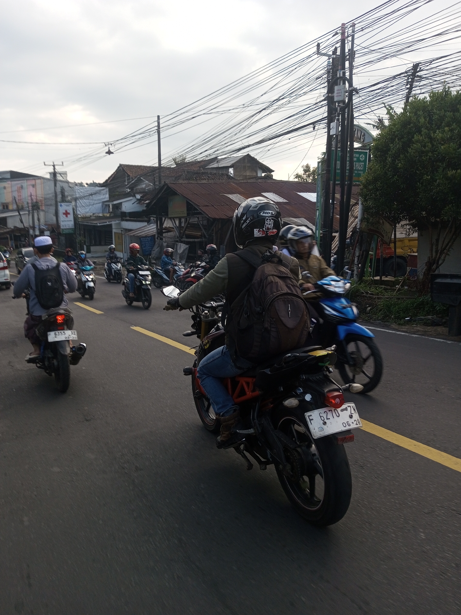 street in an urban area with a line of motorcycles traveling along a road with a yellow dividing line. The motorcycle in the foreground has a license plate that reads "F 6270 ZN 06.26". Riders are wearing helmets and backpacks. There are buildings and utility poles with numerous wires overhead. A sign with text in a foreign language is visible on a utility pole. A tree is on the right side of the road. The location is not Mya Sit Kaing Ywar Thit, Myanmar. The license plate "F 6270 ZN 06.26" suggests the location is in Indonesia.