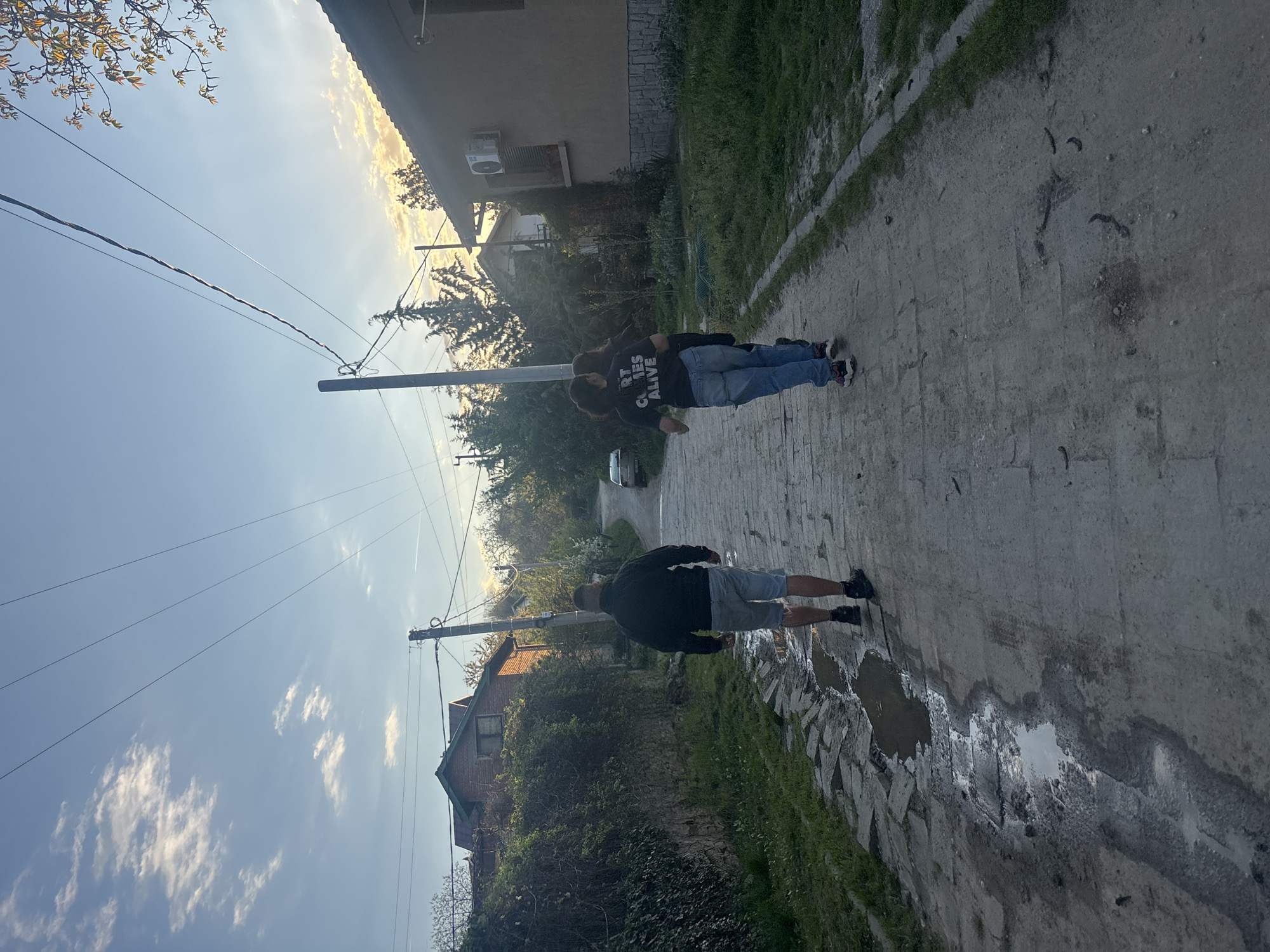 n outdoor scene, likely a street in Izvor, Bulgaria. Two people are present: one wearing a black hooded sweatshirt and jeans, standing near another individual wearing a black shirt and shorts. They are on a paved area with patches of grass and some puddles. Buildings and foliage line the sides of the street. Overhead, power lines stretch across the sky, which is partially obscured by buildings and trees. The weather appears to be clear, with a touch of sunlight suggesting either sunrise or sunset.
