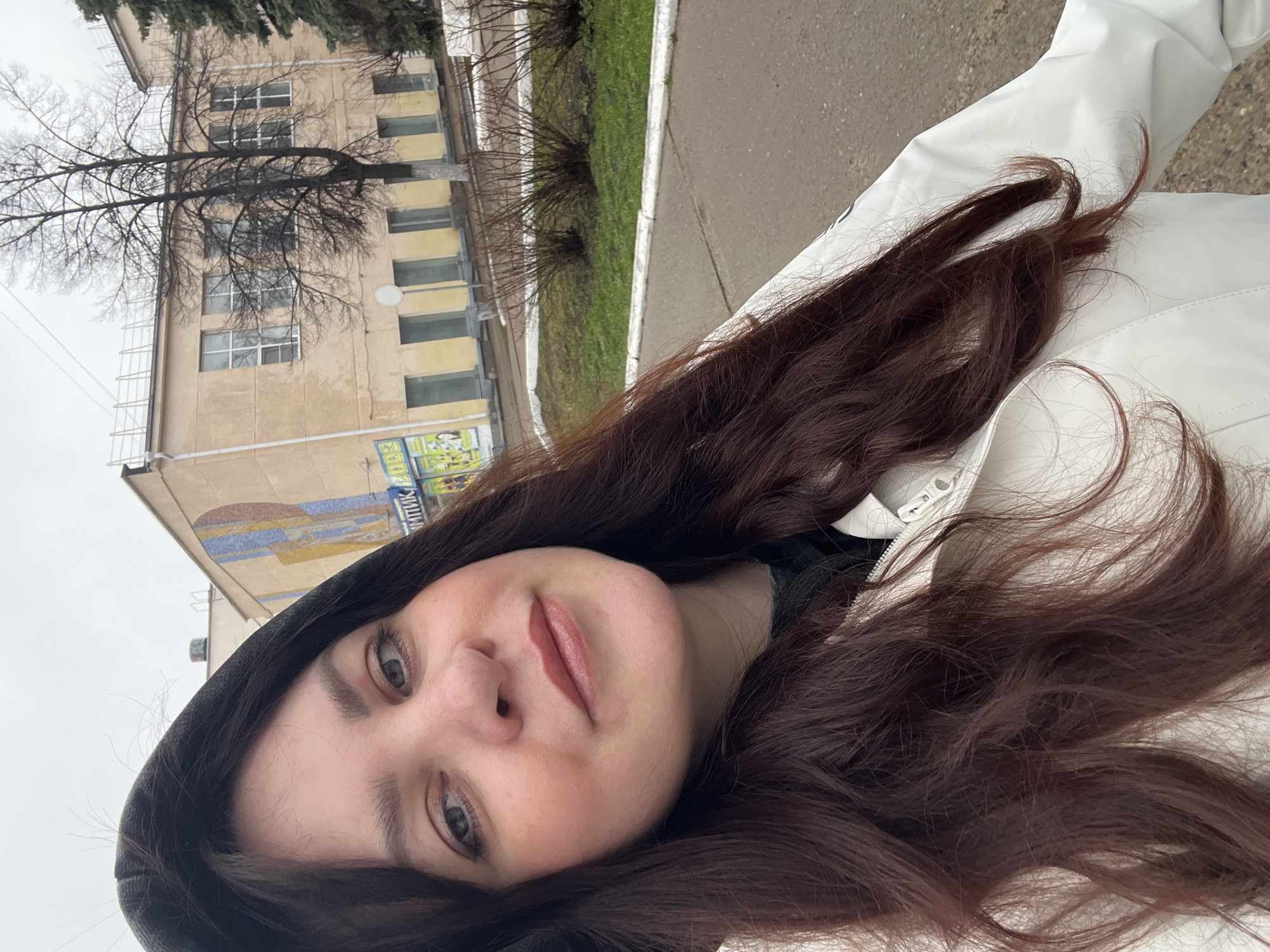 A woman with dark hair, wearing a black hooded sweatshirt and a white jacket, is taking a selfie outdoors. The background includes a multi-story building with light-colored walls and multiple windows, a bare tree, green foliage, and a sidewalk. The weather appears overcast. The building has a mural on one side. Based on the mural and building architecture, the location is likely within the city of Chaikovsky, Russia.