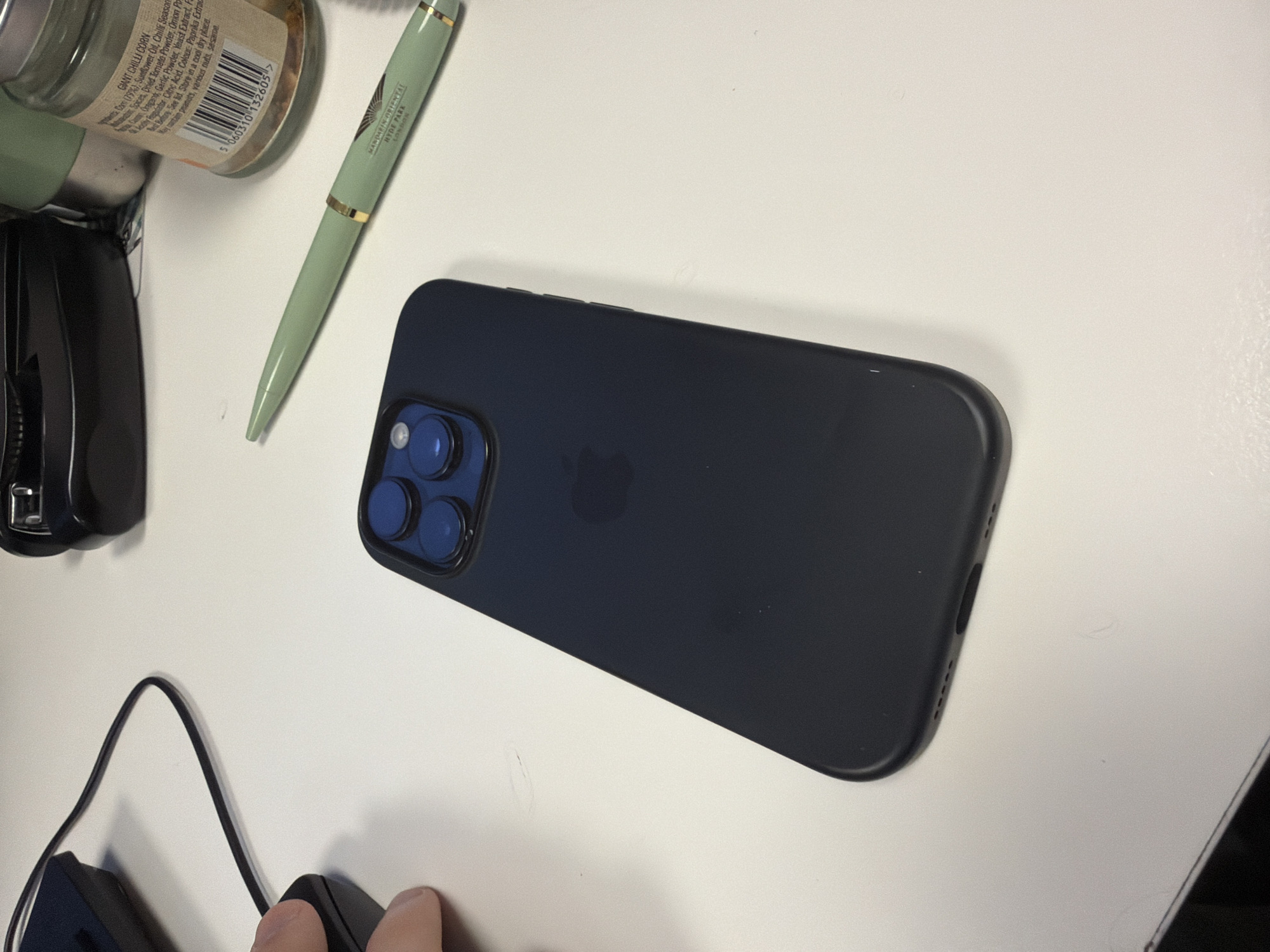 The scene depicts a white, flat desk surface, presumed to be located in London, United Kingdom, based on the inscription "MANDARIN ORIENTAL HYDE PARK LONDON" on a visible pen. A dark blue iPhone, positioned screen-down, occupies the center-right, displaying its triple camera array with blue lens protectors and an Apple logo on its rear casing. To the left, a human finger rests upon a black wired computer mouse. In the upper right quadrant, a light green pen with gold accents lies horizontally. Adjacent to the pen is a clear glass jar containing "GIANT CHILLI CORN," with a visible barcode 5060310132605 and partial ingredient list. A black office stapler is partially visible in the upper background.