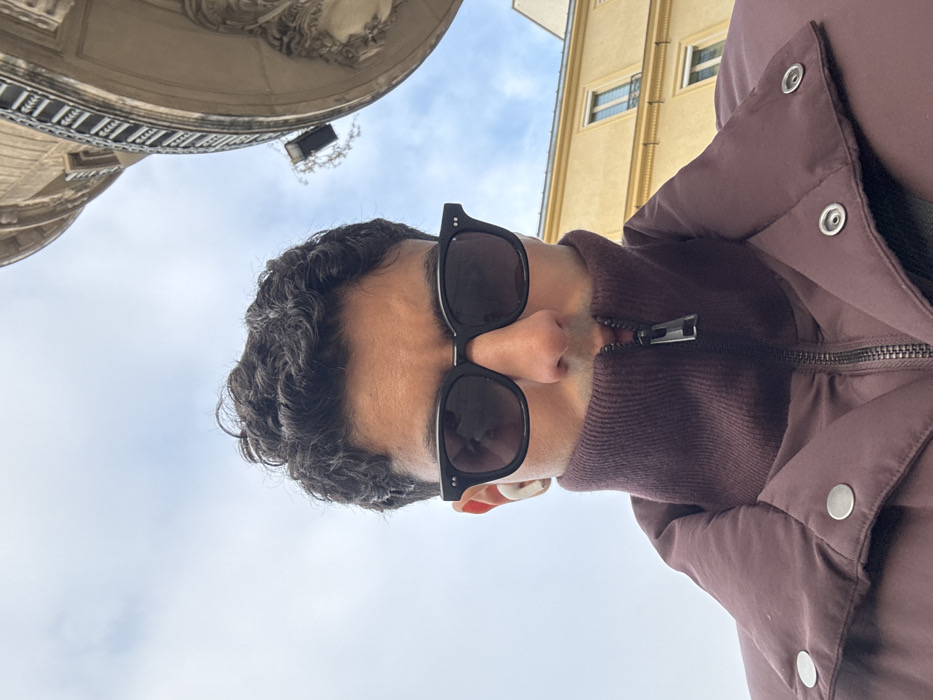 A male individual is depicted in a close-up, low-angle photograph, likely a selfie, taken in Neuilly-sur-Seine, France. The subject has dark, curly hair and is wearing black square-framed sunglasses, obscuring the eyes. A white earbud is inserted into the subject's right ear. The subject is clad in a dark plum-colored puffer jacket featuring a prominent, ribbed, high collar that is zipped up, partially covering the chin and mouth. Silver-colored snap fasteners are visible on the front of the jacket. The background consists of a light blue sky with scattered white clouds. To the upper right, an ornate light-colored stone building exhibits a curved balcony with a decorative railing and classical architectural embellishments. A dark, rectangular fixture, partially entwined with vegetation, hangs from this structure. In the lower right background, a multi-story building with a light yellow or beige facade and rectangular windows is visible.