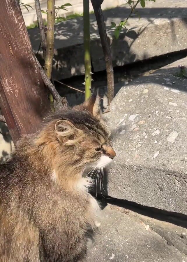 A short video shows a tabby cat being petted outdoors in bright sunlight. The cat, which is brown, gray, and tan, is sitting on rough concrete steps next to a rose bush and a wooden support beam. A hand with manicured nails and a ring appears and strokes the cat's back. The cat looks sleepy.