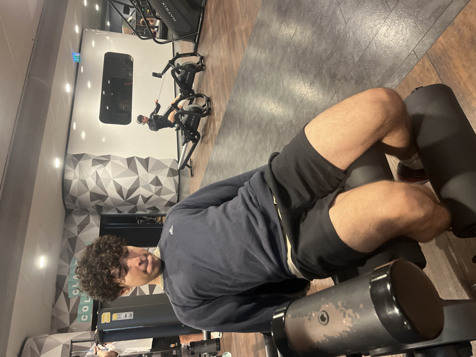 The image depicts an indoor scene within a modern fitness facility, specifically a gym located in Burjassot, Spain. In the foreground, a young adult male with curly dark hair and light skin is seated on a black and gray leg exercise machine, positioned facing forward with his legs engaged under the pads. He is wearing a dark blue long-sleeve sweatshirt with an Adidas logo, a light undershirt, black athletic shorts, red athletic shoes, and white socks. His head is slightly bowed, and his expression is neutral. In the mid-ground to the right, another young adult male is actively using a black Matrix brand rowing machine. He wears white over-ear headphones, a dark long-sleeve top, and dark shorts. Behind him, another Matrix rowing machine is visible, and further to the right, a Matrix brand stair climber machine stands next to a mirrored wall. A third individual, partially visible on the far left, appears to be standing or interacting with equipment. The gym features a modern design with a geometric pattern of gray and white triangles covering a wall section on the left. The wall to the right is white with a large, dark, rounded rectangular window or opening. The flooring transitions between a dark wood-look laminate and dark gray interlocking rubber mats. Overhead, recessed lighting illuminates the space. A partial sign reading "CLASS COL" is visible on the left wall, and a green and white exit sign is mounted on the wall to the right.
