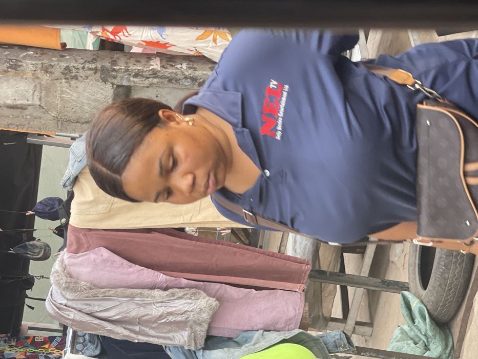 The image depicts a female individual standing in an outdoor market setting in Asaba, Nigeria. The woman, of African descent, is captured from the chest up, with her head tilted downwards and slightly to her left. She has dark hair styled with a center part. Her right earlobe displays a small, gold-colored hoop earring. She wears a navy blue polo shirt with a collar and three white buttons; a red logo "NEI TV" with "Kelly Bodas Entertainment Ltd" in white text is visible on her left chest. A brown leather shoulder bag with a patterned flap and a visible strap crosses her body. The background on the left features various garments hanging on a display structure, including a light pink/beige long-sleeved garment with fur trim, a darker pink pair of trousers, and a light beige pair of trousers. Above these, several caps are suspended. On the ground in the lower left, a green woven sack and a black tire are visible. To the right, a rough, grey concrete pillar is prominent, and beyond it, a piece of fabric with an orange and white floral pattern is partially visible. The scene conveys the environment of a typical street market or commercial area.
