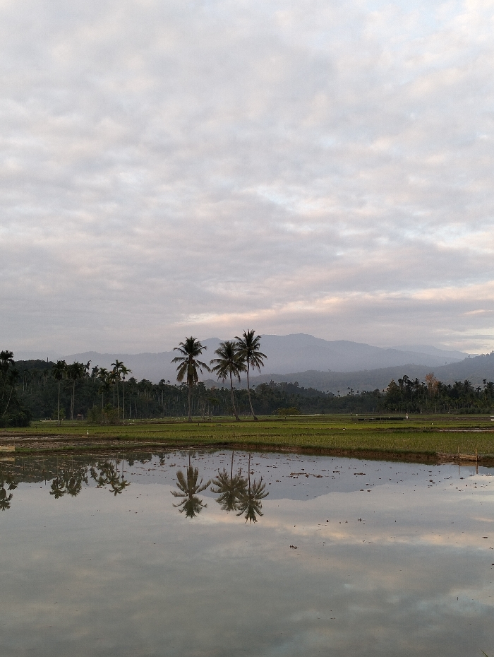 A serene landscape unfolds under a cloudy sky. Palm trees stand prominently in a rice field, their reflections mirrored in the calm water below. Distant mountains fade into the horizon, adding depth to the scene. Vegetation lines the perimeter of the field, creating a lush border. The overall image evokes a sense of tranquility and natural beauty.