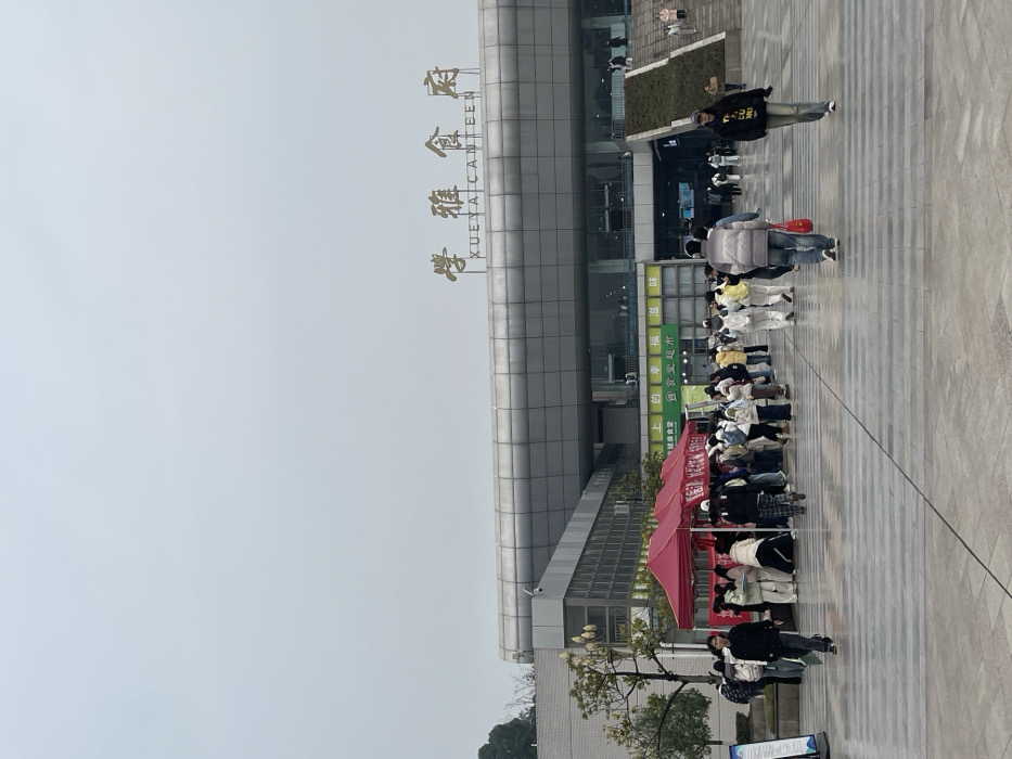A long line of people stands outside Xue Ya Canteen. The building is modern, with a sign in Chinese and English above the entrance. Red tents are set up along the line, possibly indicating booths or stalls. The sky is overcast, and the ground is paved with gray tiles. Several individuals are walking in the background, adding movement to the scene.