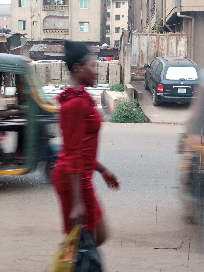 A blurred image shows a woman in a red dress walking on a street, carrying bags. Two vehicles are also blurred in the image; a green tricycle on the left and another yellow one on the right. In the background, there are buildings, a black car parked, and concrete blocks stacked against a fence.