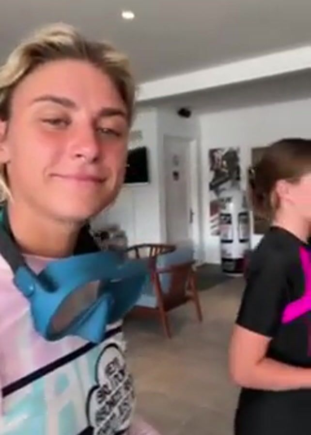 A woman with short blonde hair smiles at the camera, wearing a pink shirt with a speech bubble design and blue swim goggles around her neck. Another woman in a black and pink wetsuit walks behind her, smiling. The first woman is holding the camera. In the background is a room with light-colored walls, seating, and a television. Other people are seated in the background.