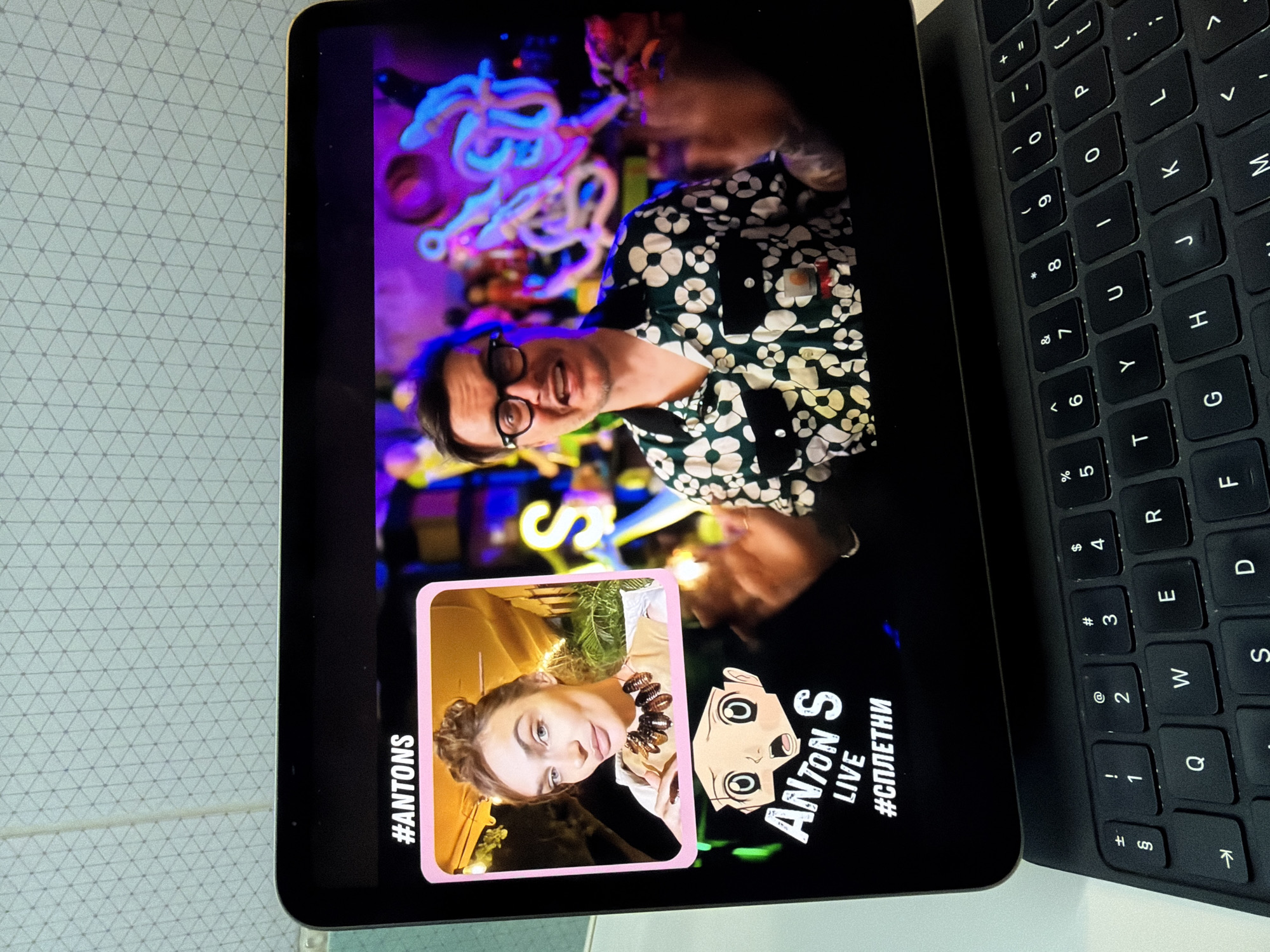 tablet displaying a live broadcast from "Anton S," possibly in Dreiliņi, Latvia. A man with glasses and a patterned shirt is the main subject in the broadcast, with neon lights in the background. A smaller window displays a woman. The tablet is placed next to a black keyboard, with a patterned tile surface partially visible.