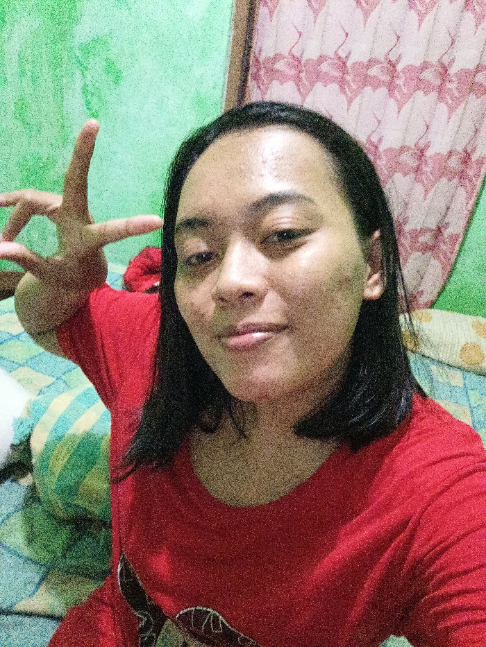 An individual, appearing to be an adult female, is depicted in a close-up selfie within an interior room located in Kecamatan Pati, Indonesia. The subject possesses dark, shoulder-length hair and is wearing a long-sleeved red shirt. She is positioned facing the camera, making direct eye contact, with a slight smile on her face. Her left arm is raised, and her hand is visible in the upper left quadrant, displaying a "V" gesture (peace sign) with the index and middle fingers extended. The background consists of a textured, light green wall on the left and a partially visible patterned curtain or fabric with a pink and white design on the right. Below the subject's left arm, a striped pillow or cushion in light blue, yellow, and white is discernible, along with additional patterned bedding or fabric.