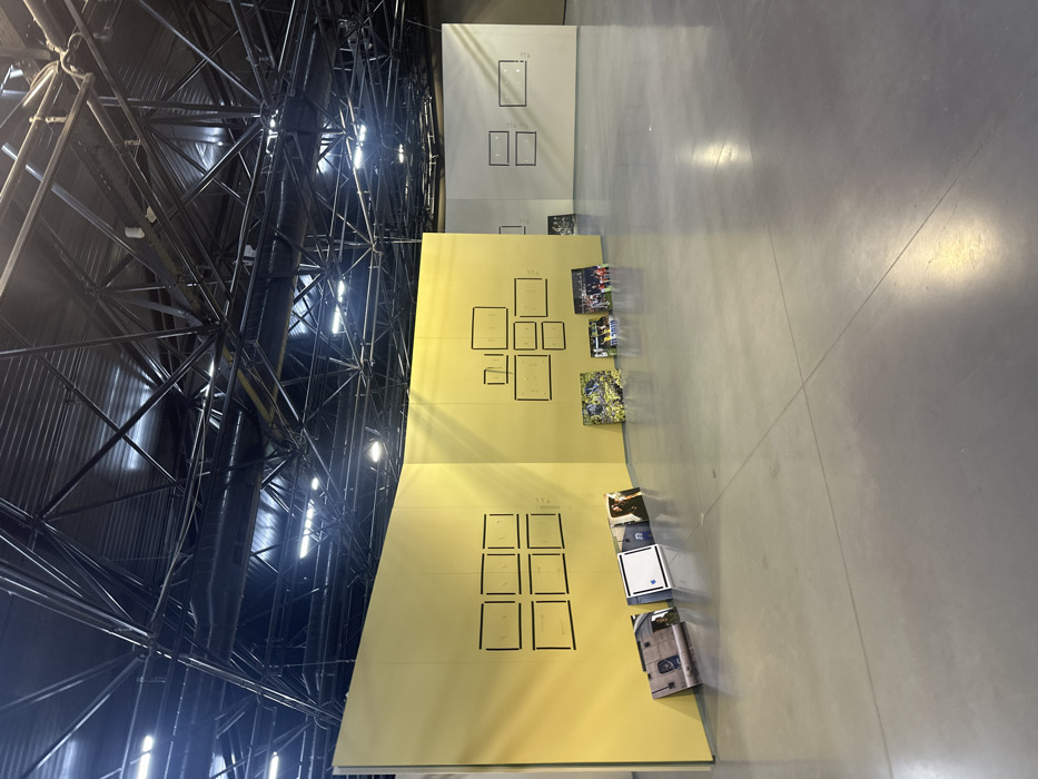 The image depicts an indoor exhibition space, likely within the Tel Aviv Exhibition Center (Expo Tel Aviv) in Tel-Aviv, Israel. The environment features a high industrial-style ceiling with exposed black metal trusses, ducts, and numerous overhead fluorescent or LED light fixtures. The floor is polished light gray concrete with visible expansion joints, reflecting the overhead lighting. In the foreground and midground, a series of modular exhibition walls are arranged. The primary set of walls is a bright, slightly warm yellow, configured in an angular manner. On the left section of the yellow wall, eight black rectangular outlines, arranged in two rows of four, are visible. On the right section of the yellow wall, a cluster of approximately eight irregular black rectangular outlines of varying sizes is present. Leaning against the base of the yellow walls on the floor are several unframed or temporarily placed printed images. On the left, a group of five prints displays various subjects, including what appears to be an interior scene and one with a blue and white design. On the right, three larger prints are visible; one depicts a dense field of yellow flowers or foliage, and another shows people on a field, possibly a sporting event, with Hebrew text that appears to read "מכבי ת"א 2019" (Maccabi TA 2019). In the background, further exhibition walls, primarily white or light gray, are visible, also featuring black rectangular outlines for displays. No people are present in the scene, suggesting the exhibit is either in setup, dismantling, or closed. The items are static; no actions or interactions are depicted.