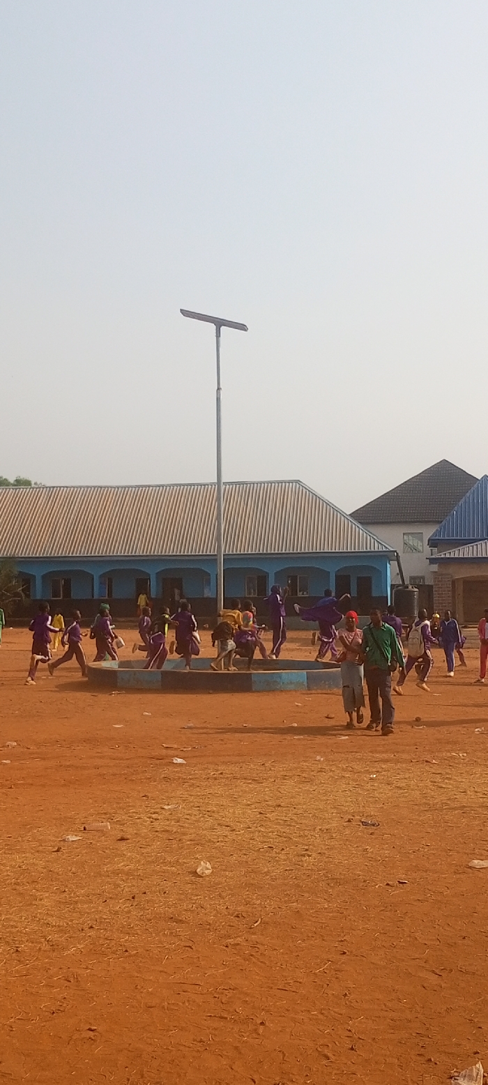 The image depicts an outdoor scene in Tuaniako, Nigeria, under an overcast or hazy sky. The foreground consists of reddish-brown dirt and dust, sparsely covered with dry vegetation and scattered litter, including white plastic bags. A tall, grey metallic pole with a rectangular solar street light fixture at its top stands centrally in the midground. Surrounding the base of this pole is a low, blue and white painted octagonal or circular structure, possibly a planter or a boundary. Behind this structure and pole, a single-story building with blue walls and a light-colored corrugated metal roof extends across the frame. This building features multiple arched doorways and windows. Further in the background, additional residential-style buildings with dark and blue roofs are visible. Numerous individuals are present, predominantly children appearing to be in school uniforms of varying shades of purple, blue, and yellow. They are actively engaged in running and playing across the dusty ground, particularly around the blue and white structure. Their movements suggest dynamic activity. Two adults are observed in the mid-foreground, walking from right to left. One male wears a green long-sleeved shirt and dark trousers. The other adult, a female, wears a light-colored patterned top and a light skirt, possibly holding hands with the male. All individuals are oriented towards the activities or moving through the space.