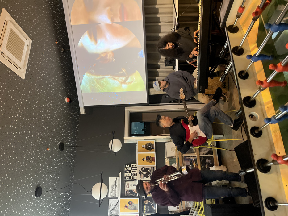 The scene depicts four adult males engaged in a musical performance or rehearsal within an indoor establishment in Rafailovići, Montenegro. In the immediate foreground, a white foosball table with red and blue player figures is visible. From left to right: a male wearing a dark cap and maroon jacket stands, playing a silver trumpet; a second male, of Asian ethnicity, sits on a yellow metal stool, playing a red electric guitar with a white pickguard; a third male, wearing a grey hoodie and baseball cap, sits on a wooden box, observing; and a fourth male with long, dark curly hair sits, playing a black Kawai electronic keyboard. A large white projection screen behind the performers displays a stylized, split image of a human face with vibrant green, yellow, and orange tones. The room features dark grey walls and a dark ceiling with a white speckled pattern. Two modern pendant lights with spherical white diffusers and dark frames hang from the ceiling, which also contains a white square air conditioning vent and a red circular smoke detector. On the left wall, shelves display various records or artworks, some labeled "BLACK WHITE" and "Miles Davis." A white doorway is partially visible in the background. A black speaker unit is positioned on the floor to the left of the trumpet player.