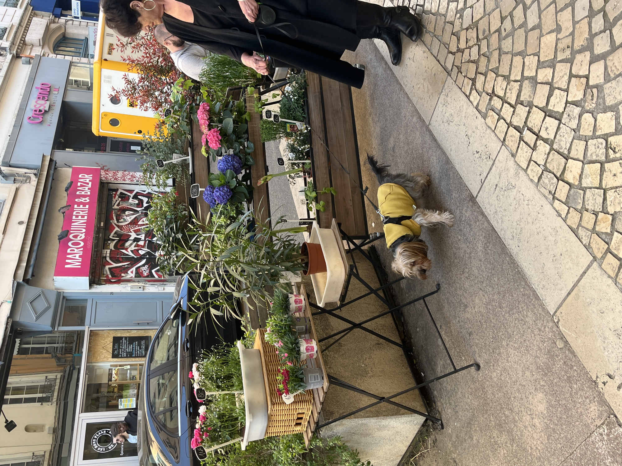 This image captures a street scene at 27-29 Rue de Condé in Lyon, France. The foreground displays a composite sidewalk surface, with textured dark grey concrete on the left, light grey flagstones in the center, and a pattern of small, light-colored cobblestones on the right. A small, light brown and grey Yorkshire Terrier-type dog, wearing a bright yellow coat, stands on the concrete portion of the sidewalk. It is attached to a black retractable leash held by a Caucasian woman, who is positioned to the dog's right. The woman, appearing middle-aged, has dark, short hair and wears large gold-colored hoop earrings, a long black coat, and black boots. A silver-colored bracelet is visible on her right wrist. Her gaze is directed forward and slightly downward. Partially obscured behind the woman and the flower display is a man with light hair and a beard, wearing a grey hooded sweatshirt. Adjacent to the sidewalk is an outdoor flower stall. It features a small black metal folding table holding a white rectangular plastic planter with a potted plant and another similar empty planter. A larger, multi-tiered wooden display unit showcases various potted plants and flowers, including prominent blue and pink hydrangeas, dianthus, and other green plants. Several plants bear white price tags indicating Euro denominations. A large, light-brown wicker basket is also part of this display. In the midground, a black sedan is parked parallel to the sidewalk, facing left. Behind the flower stall, a row of commercial storefronts lines the street. To the left is "Les Bons Plants Épicerie Fine" at number 27, a white-framed shop with large glass doors, where two men are visible inside. Next is a light grey-blue door with a decorative diamond feature above it. Adjoining this is "MAROQUINERIE & BAZAR" at number 29, characterized by its bright pink sign with white lettering and extensive red, black, and white graffiti covering the lower facade. Further down, a yellow and white portable utility unit, marked with "VELOUTOU" text, precedes "Crescendo Agence d'Emploi," which has a grey facade and a pink sign. The background consists of multi-story buildings with typical European architectural details. The scene is illuminated by daylight, casting some shadows towards the left.