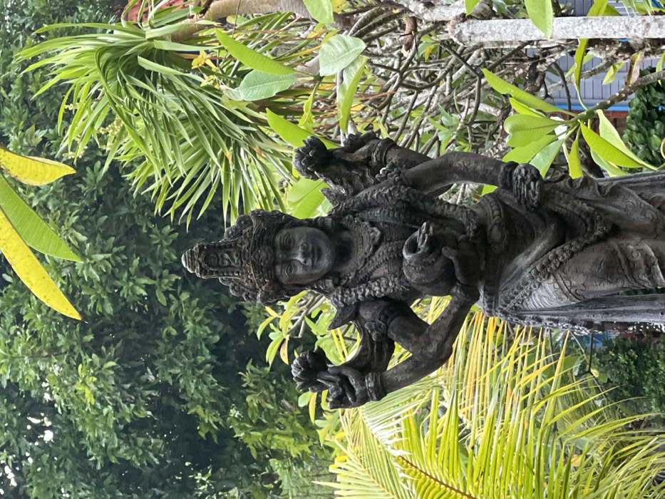A gray statue of a woman with multiple arms stands amid lush greenery