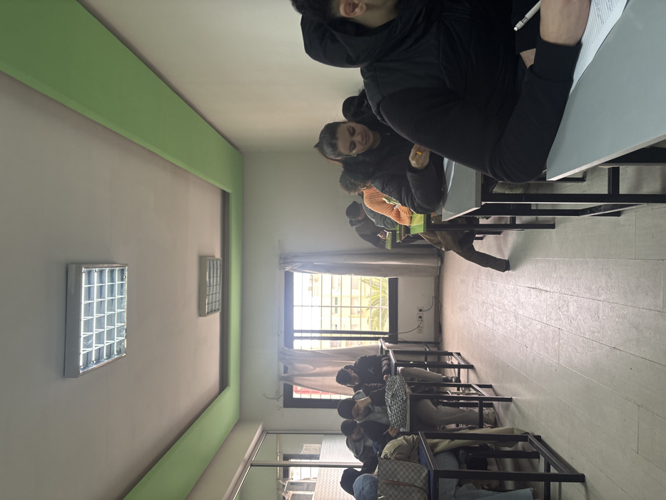 The image depicts the interior of a classroom in Fez, Morocco, during daylight hours. Approximately 10 to 15 young adults are seated at individual desks, engaged in what appears to be an examination or study session. The room features off-white walls with a horizontal lime-green band below the ceiling, which is also off-white and fitted with two rectangular fluorescent light fixtures with gridded diffusers. The floor is covered with light grey or off-white tiles. A large window unit occupies the upper portion of the left wall, featuring white vertical bars and partially drawn beige curtains. Through the window, an urban residential area with other buildings and some greenery is visible. A white electrical outlet is positioned on the wall beneath the window. On the far left, a reflective surface, possibly a large mirror or glass partition, shows faint reflections and white graphic elements. Students are seated at light grey rectangular desks with black metal frames, arranged in rows. Most individuals wear casual attire, including jackets and hoodies; some wear head coverings. All visible students are looking down at their desks, actively writing or reading papers. A white pen is visible in the hand of the student in the foreground right, while a yellow pen or marker is held by a female student in a black puffer jacket in the mid-ground right. A patterned handbag rests on a desk in the mid-ground left. The overall scene suggests a focused academic environment.